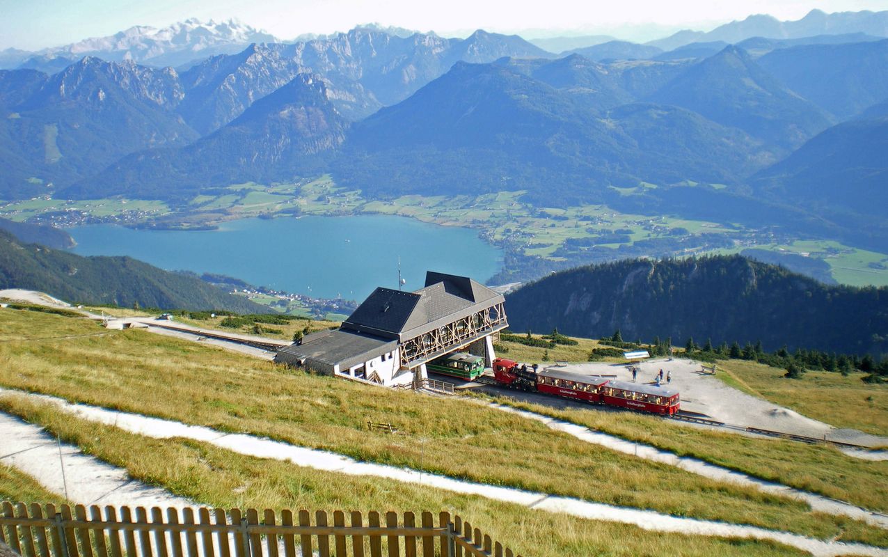 Mit der Schafbergbahn gelangen Sie in etwa 45 Minuten hoch zur Bergstation, wo Sie sich auf einen unvergleichlichen Panoramablick freuen können. Und zwar nicht nur auf den Wolfgangsee, sondern auf weitere zwölf Seen des Salzkammergutes, darunter der Mondsee, der Fuschlsee und der Attersee.